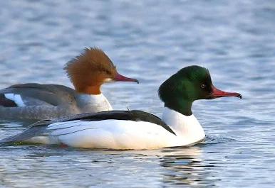 The Common Merganser, also known as the Goosander, is a large diving duck (length 58–67 cm) with a long, sleek body and a narrow, serrated red bill adapted for catching fish.