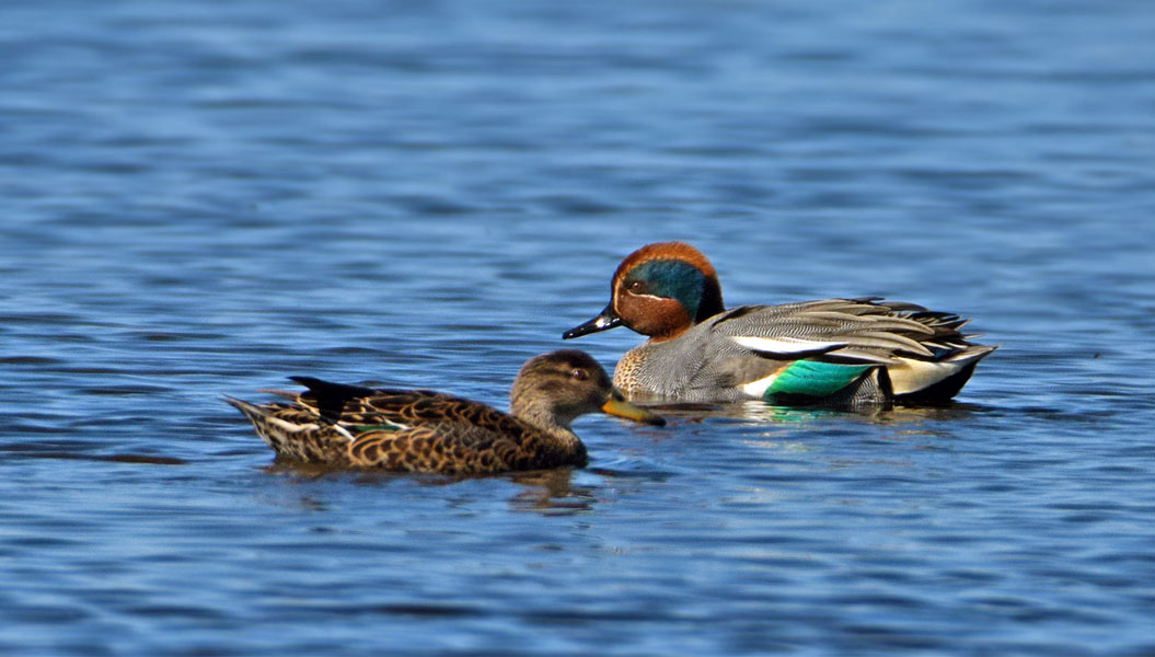 The Eurasian teal is Sweden’s smallest duck, about 35–40 cm long. The male has a chestnut-brown head with a green eye patch bordered by thin white lines, a grey body, and a light under-tail area. The female is mottled brown and resembles a small female mallard but has a green wing patch. Both sexes show a light leading edge on the wing, visible in flight.