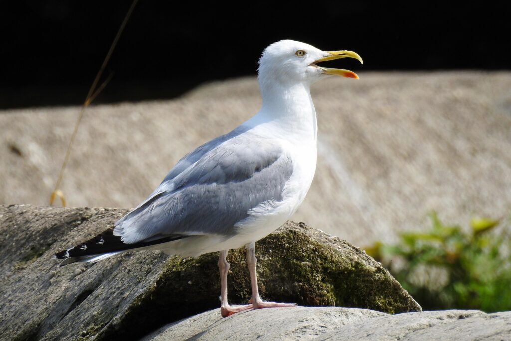 • Stor ljusgrå mås med vit undersida, rosa ben och gul näbb med röd fläck.