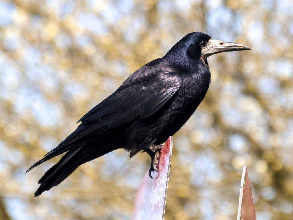 Råkan känns igen på sin rakare näbb, blankare fjäderdräkt och ljudliga kraxande läten.