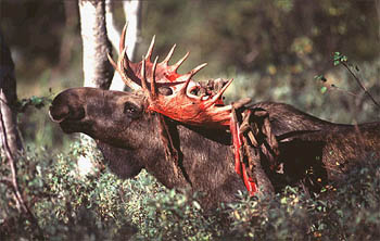 New antlers start growing in spring and are covered with velvet skin, which dries in August when the moose rubs it off (thrashes).