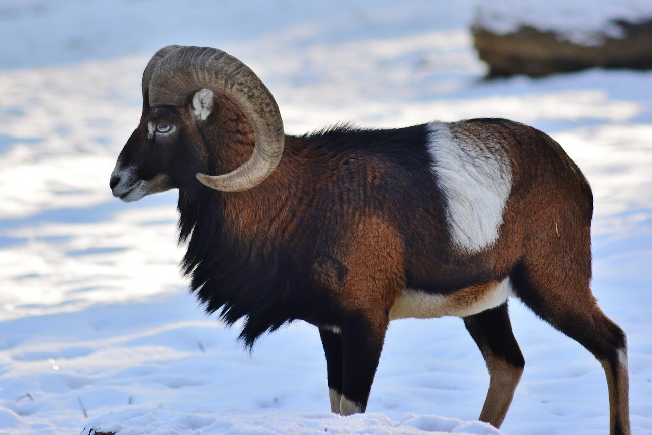 Mouflon belong to the group of hollow-horned animals. Unlike deer, they do not shed their horns. Instead, the horns grow in length and thickness throughout life. The ram’s horns are crescent-shaped and curved, and in adult animals, they are often almost a full spiral or more. Ewes are smaller and either lack horns or have only short horn stubs.