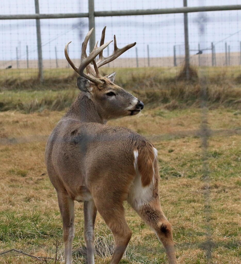 The white-tailed deer is a medium-sized deer with a slender body and long legs. It measures 150–200 cm in length and stands about 90–110 cm high at the shoulder. Its coat is reddish-brown in summer and grayish-brown in winter. The most distinctive feature is its long, white tail, which it raises as a warning signal when alarmed. The male (buck) has antlers with several points that are shed each winter and regrown in spring. The female (doe) is smaller and lacks antlers.